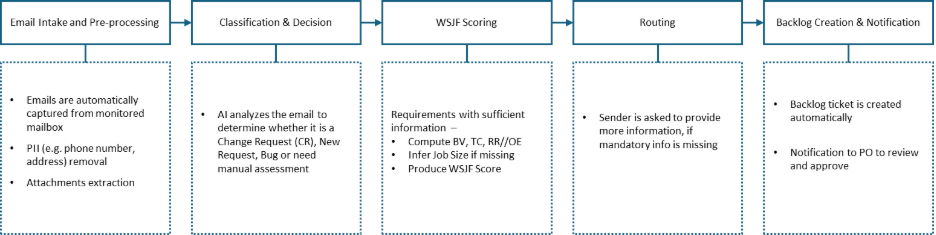 WSJF Prioritisation: AI classification alone isn’t enough. What matters is what gets done first. Each request is evaluated using SAFe® WSJF scoring: Business Value, Time Criticality, Risk Reduction / Opportunity Enablement and Job Size (effort). Even when job size is not provided, the agent intelligently infers it from the information from email. This transforms AI systems from “classifiers” into a decision-makers.
